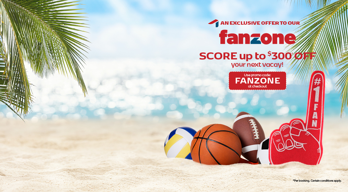 Promo code discount FANZONE is only applicable on new pre-packaged vacation bookings made online from May 1 – July 31, 2024, for travel May 1 – Dec 31, 2024. $50 discount is applicable to bookings with a minimum purchase price of $899 - 1298.00 per person (before taxes & fees), unless otherwise stipulated on your promo code. Eligible on double, triple, and quadruple occupancy bookings. One promo code per booking (value of $50). Single occupancy bookings with a minimum purchase price of $899 - $1298.00 will receive a $25 discount per booking. $75 discount is applicable to bookings with a minimum purchase price of $1299.00 to $1498 per person (before taxes & fees), unless otherwise stipulated on your promo code. Eligible on double, triple, and quadruple occupancy bookings. One promo code per booking (value of $75). Single occupancy bookings with a minimum purchase price of $1299 - $1498.00 will receive a $37.50 discount per booking. $125 discount is applicable to bookings with a minimum purchase price of $1499.00 to $3998 per person (before taxes & fees), unless otherwise stipulated on your promo code. Eligible on double, triple, and quadruple occupancy bookings. One promo code per booking (value of $125).Single occupancy bookings with a minimum purchase price of $1499 - $3998.00 will receive a $62.50 discount per booking. $200 discount is applicable to bookings with a minimum purchase price of $3999.00 to $6998 per person (before taxes & fees), unless otherwise stipulated on your promo code. Eligible on double, triple, and quadruple occupancy bookings. One promo code per booking (value of $200). Single occupancy bookings with a minimum purchase price of $3999 - $6998.00 will receive a $100 discount per booking. $300 discount is applicable to bookings with a minimum purchase price of $6999.00 and up per person (before taxes & fees), unless otherwise stipulated on your promo code. Eligible on double, triple, and quadruple occupancy bookings. One promo code per booking (value of $300). Single occupancy bookings with a minimum purchase price of $6999.00 will receive a $150 discount per booking. Promo code cannot be exchanged for any cash value and must be entered or provided at the time of booking. The promo code discount amount is non-negotiable. Not combinable with any other discounts or promo codes. Not applicable to group bookings. The promo code offer is capacity controlled and can be changed or withdrawn at any time without notice. Promo Code must be provided at the time of booking.redtag.ca reserves the right to expire the promo code if it is not redeemed.