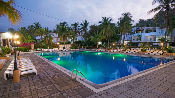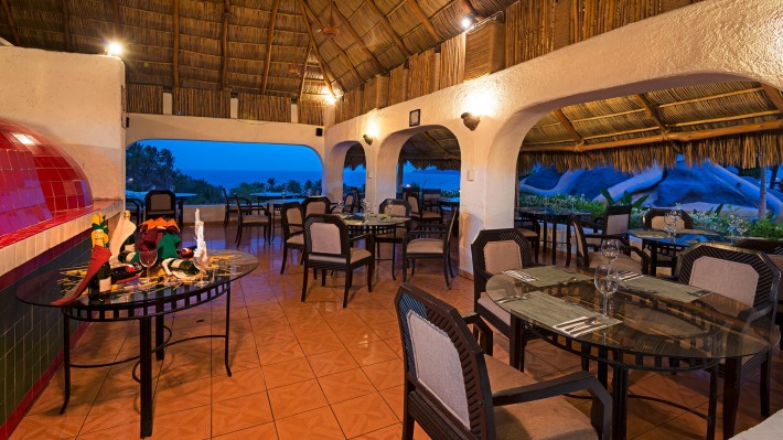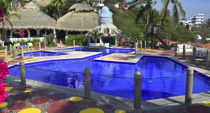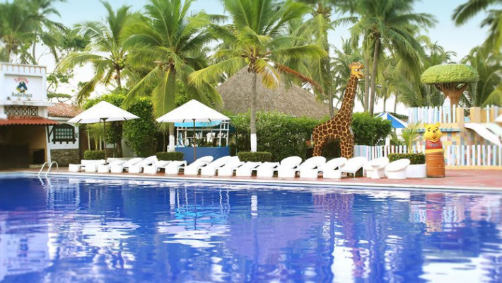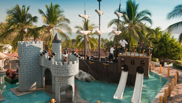 Located on a hill side, across the street from the beach, this beautiful hotel resembles a Mexican village town with cobble streets and clay tile roofs. This family-oriented All Inclusive resort is at only 15 minutes from downtown Manzanillo and only 20 minutes from the international airport. It has 250 rooms, with Mexican contemporary decoration. Services included are one Buffet Restaurant, one themed restaurant with alternated Italian and Caribbean menu. four bars, Palapa snack bar, Beach snack-bar • Tennis courts (not lighted), two Zip-lines (One for adults and one for children), Wall climbing, Children’s Club, Baby Club, Pool tables, Gym , Mini-golf, Safety deposit boxes at reception, wireless internet in public areas. The property also has a nice beachfront restaurant with a seafood menu, for an additional charge. Serves breakfast, lunch and dinner, and is also open for locals. All rooms feature one king sized bed or two twin sized beds. Maximum occupancy per room is three adults or two adults and two children. Children under 11 stay for free, one child per paying adult. Maximum 2 children per room.Activities for children also include a weekly camp-out night, supervised by our entertainment staff, as well as a fun Pirate Treasure Hunt.